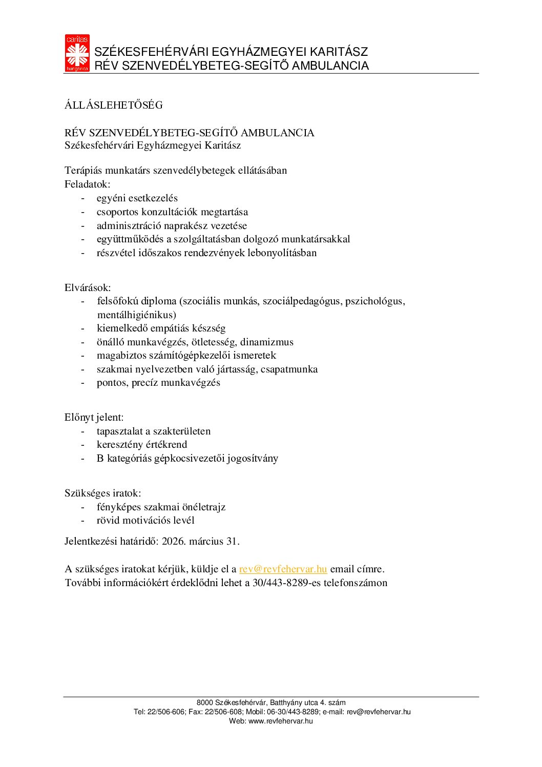 RÉV SZENVEDÉLYBETEG-SEGÍTŐ AMBULANCIA Székesfehérvári Egyházmegyei Karitász Terápiás munkatárs szenvedélybetegek ellátásában Feladatok: egyéni...