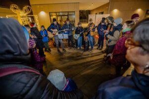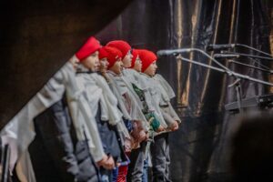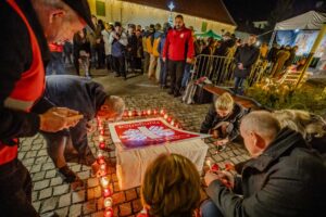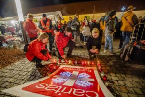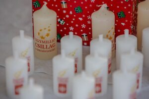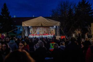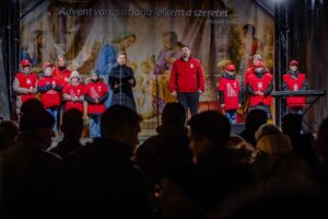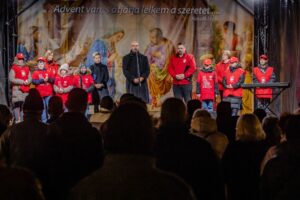 Az este csúcspontjaként a jelenlévők a cserkészekkel és a Caritas Juniorokkal együtt gyújtották meg a szolidaritás gyertyáiból kirakott fényalakzatot, a szeretet lángoló keresztjét, amely a közös felelősségvállalás és a rászorulók iránti irgalmasság jelképeként ragyogott fel a móri adventi estén.