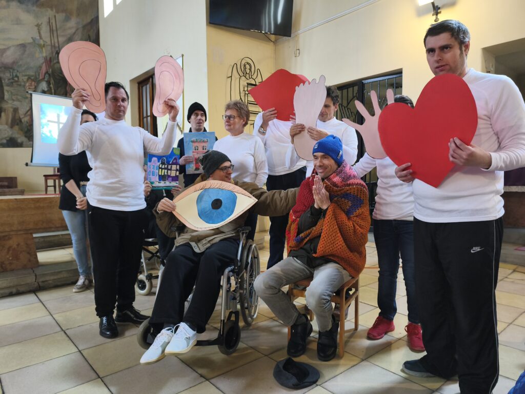 Az ellátottak egy különleges, szívhez szóló előadással is készültek az ünnepre. A „Mese egy kicsi kézről” című történeten keresztül mutatták be azt a tiszta jelenlétet, amely többet ér minden anyagi ajándéknál. A mese üzenete mélyen megérintette a jelenlévőket: bár a főhős nem tudott semmit adni az árva gyermeknek, a legtöbbet nyújtotta, amit ember adhat. A szeretetet. Az előadás záróképe – ahogy együtt ültek az „utca kövén” – a krisztusi sorsközösség és az elfogadás gyönyörű szimbólumának motívumát mutatta be.